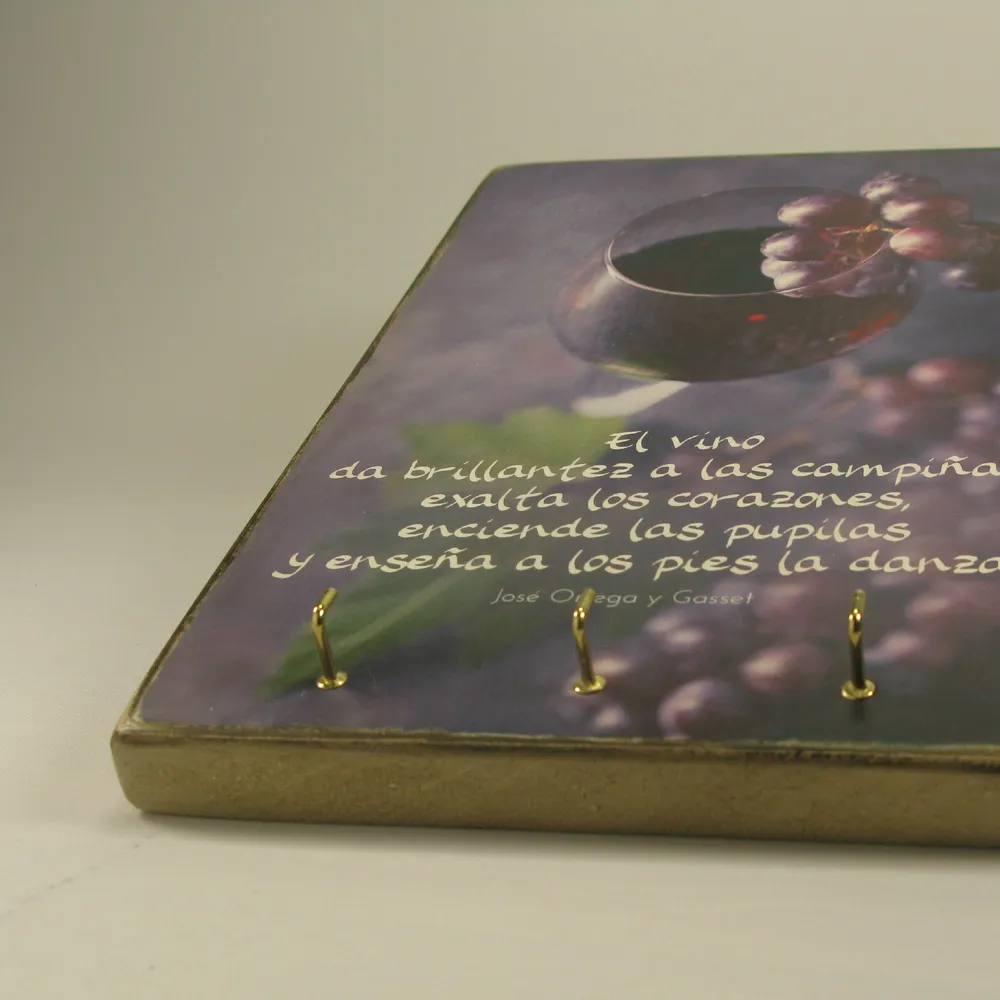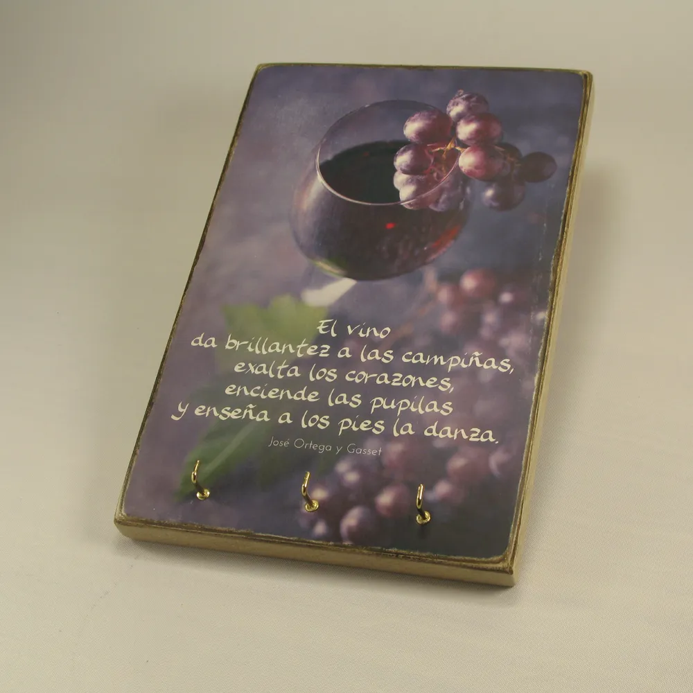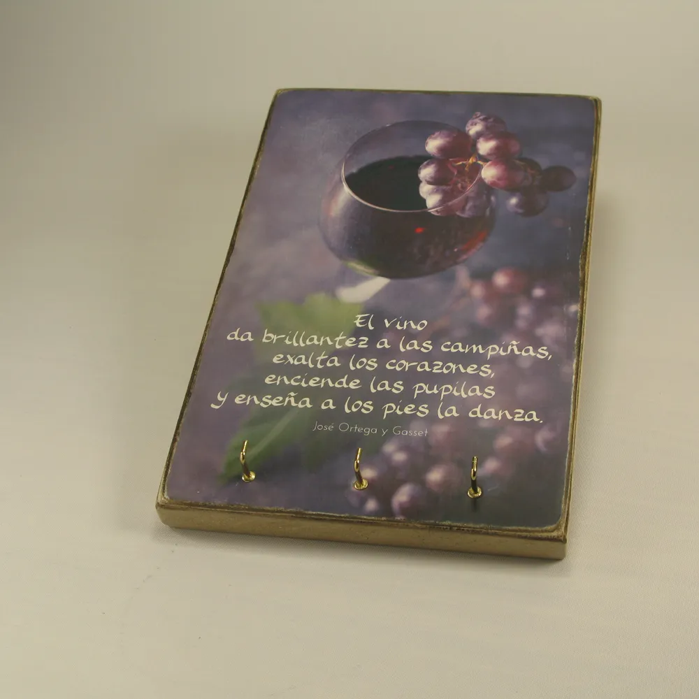 Este es un trabajo artesano que utiliza el vino como símbolo del esfuerzo compartido y la brillantez como metáfora de lo que realmente ilumina la vida: el amor y las buenas relaciones. Al estar hecho a mano, cada pieza es única y exclusiva. Además, incluye ganchitos para ofrecer un lugar donde colgar tus llaves o complementos, de forma que hace de este un objeto bello y práctico a la vez.