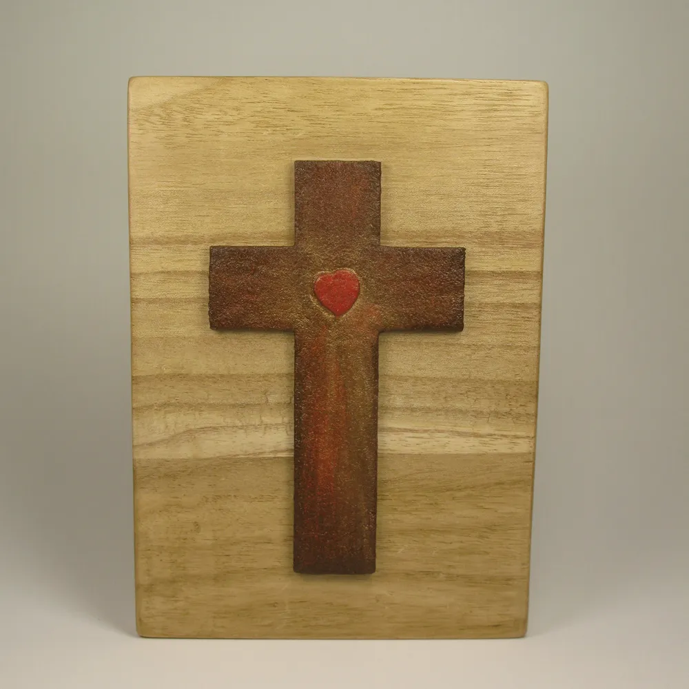 Oficio: pulido manual con ceras y betún de Judea para la base; texturizado manual y pintura artística con énfasis en la calidez del tono carmín para la cruz.