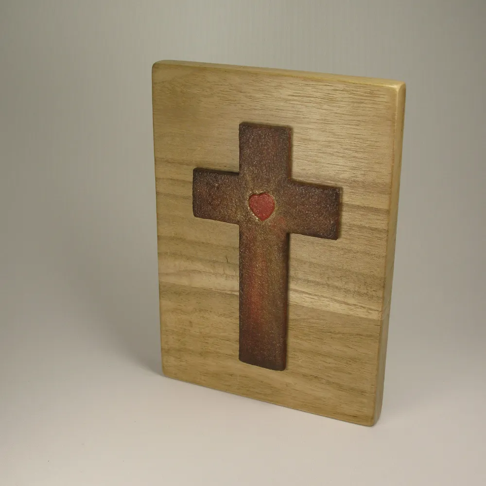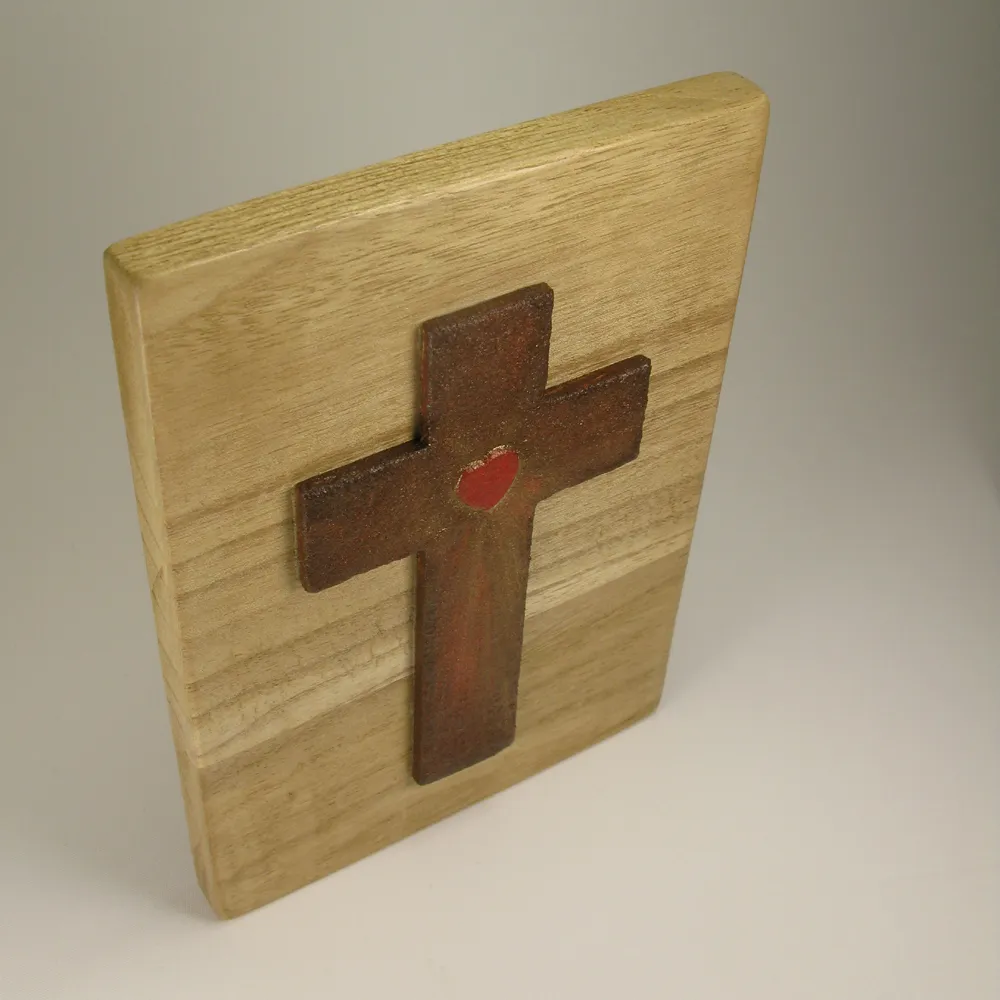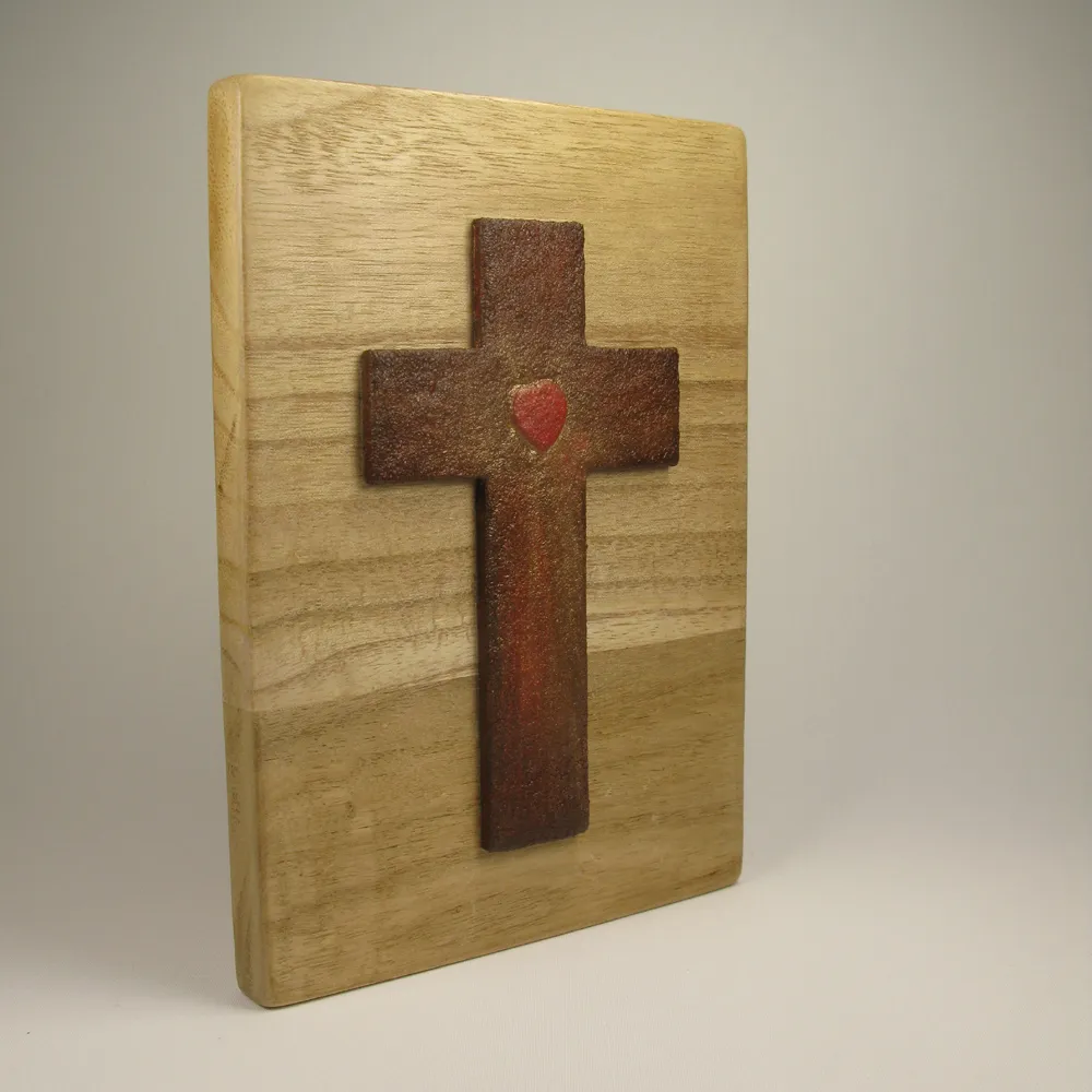 Materia: madera de paulownia, noble y ligera, con veta vista para la base, y madera texturizada para la cruz.