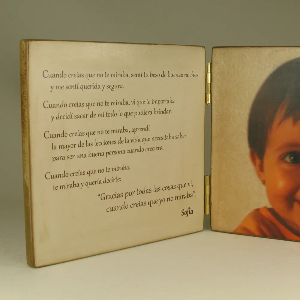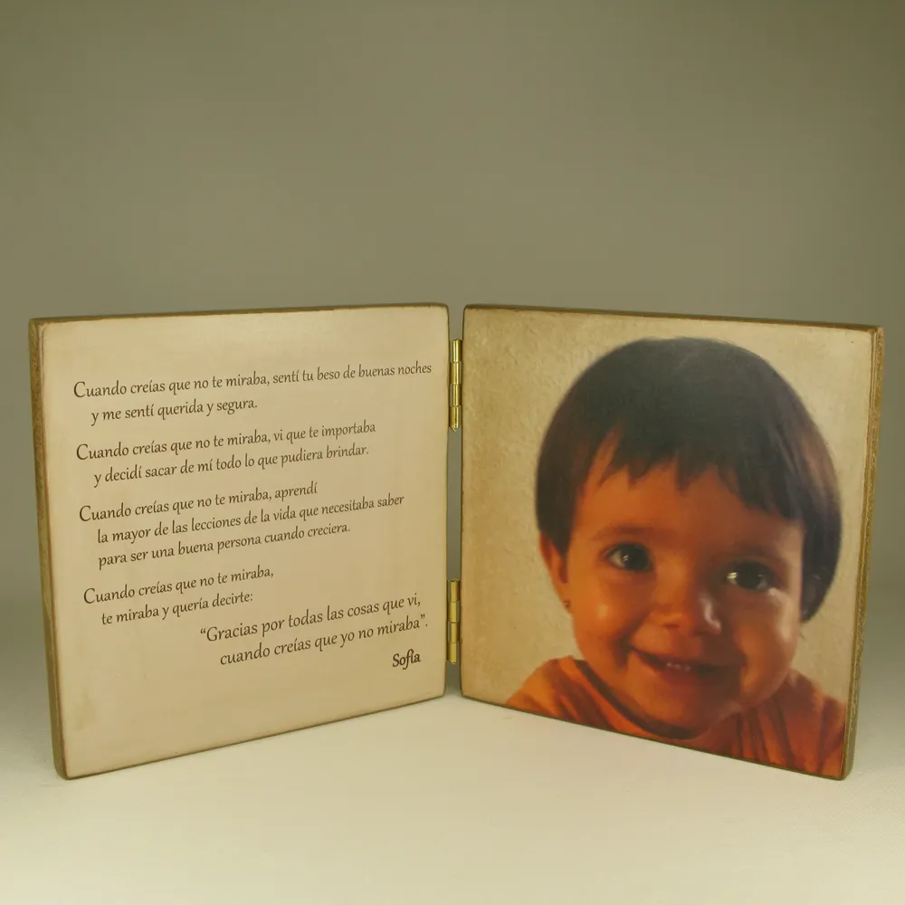 Composición de dos cuerpos que integra fotografía y texto personalizado. Un detalle creado para honrar el papel de padres, abuelos, profesores o padrinos en nuestra historia.