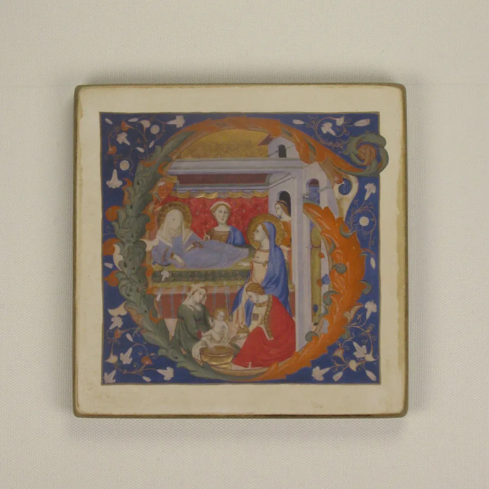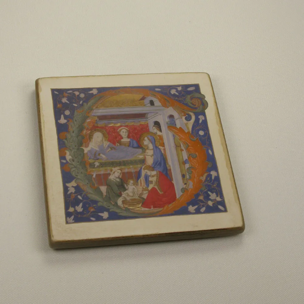 Esta pieza reproduce el momento del nacimiento de la Virgen María, enmarcado por el vibrante colorido y los motivos florales de la miniatura original.