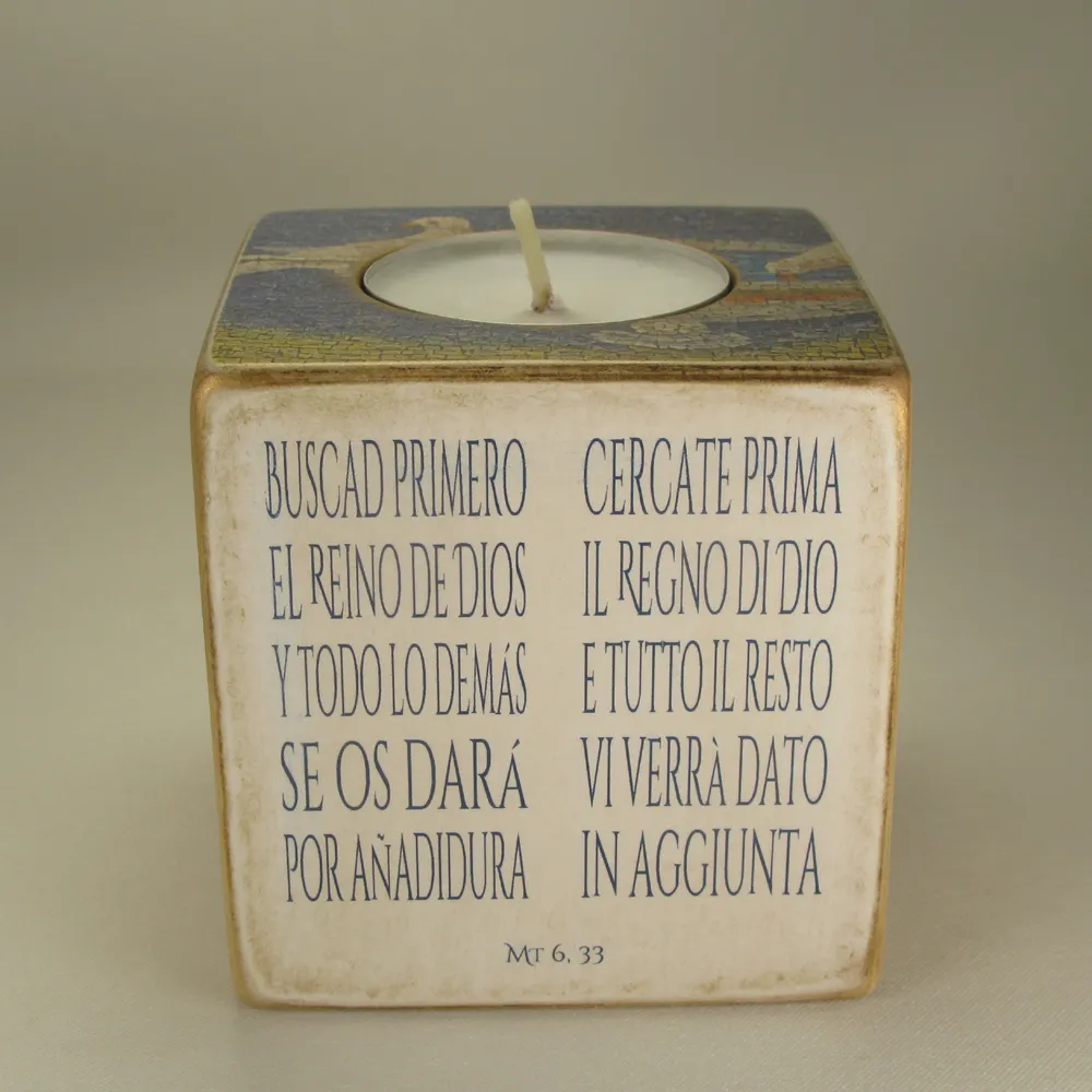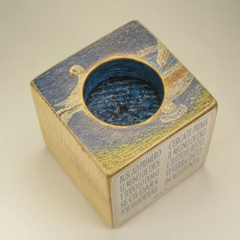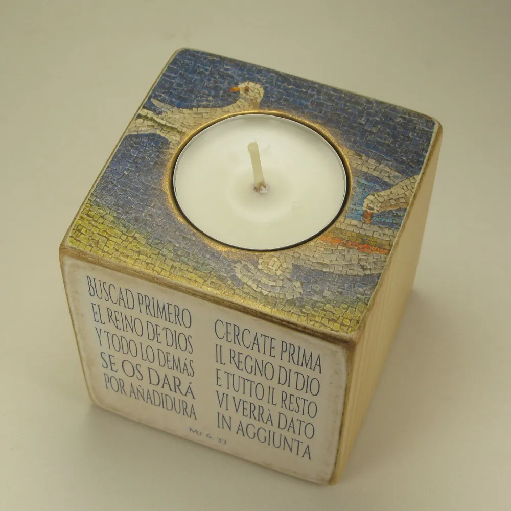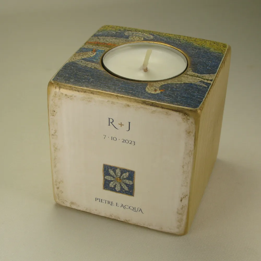 Portavela de madera con aplicaciones en polvo de oro. Presenta una reproducción de las palomas del mosaico del Mausoleo de Galla Placidia (en Rávena) en su cara superior, fondo interior pintado en azul agua y personalización completa con iniciales, fecha y textos en varios idiomas.