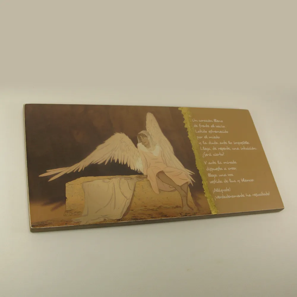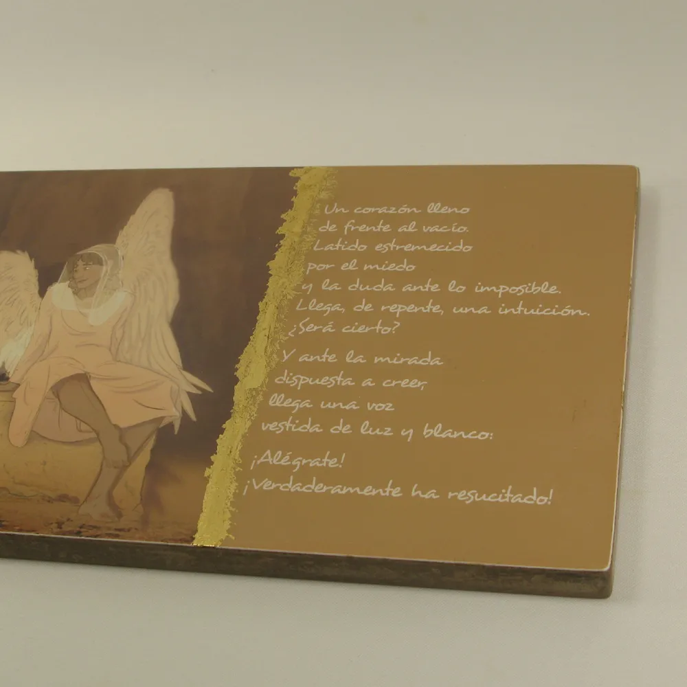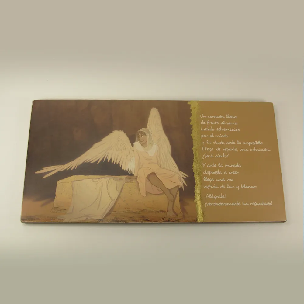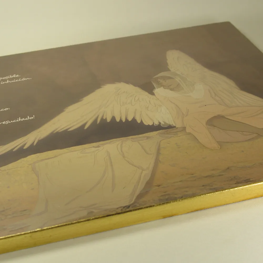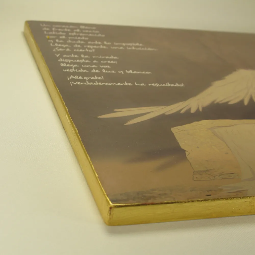 Es el eco de una voz que nos pide que nos alegremos. Un objeto sencillo que nos recuerda que la muerte ha sido vencida y que el Amor vive para siempre entre nosotros. El uso del dorado en la obra es símbolo de la intervención de Dios Padre en el acto supremo de la Salvación.